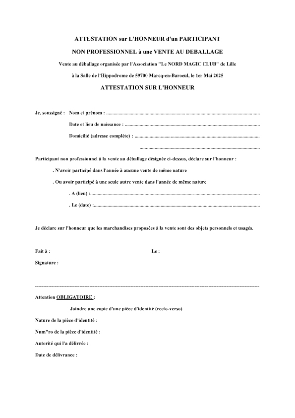 Pour toute inscription « exposant », merci de télécharger, compléter et nous renvoyer également l’attestation sur l’honneur relative à la « vente au déballage ».